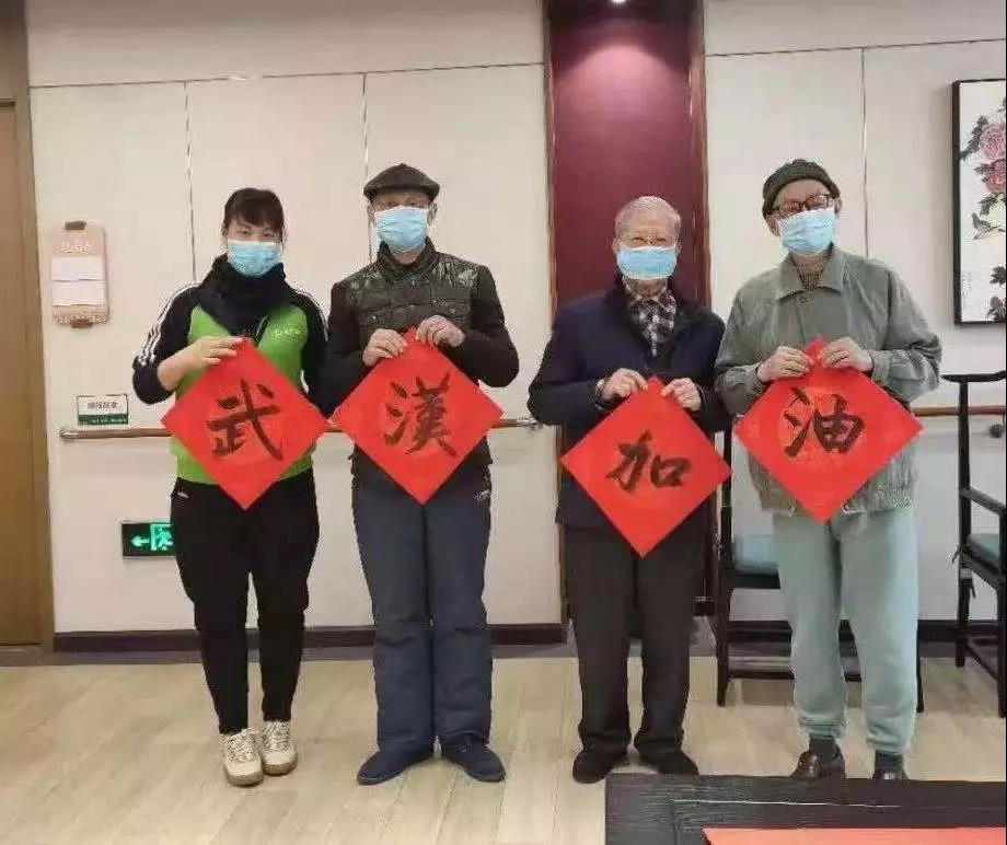 院内,一班喜爱书法的长者们在15楼自发组织了一次挥毫送福活动,他们写下“武汉加油”、“中国加油”、“团结一心”、“抗击病毒”、“众志成城”等条幅,为武汉抗疫前线的医护人员送上祝福,也为院内的工作人员加油打气。