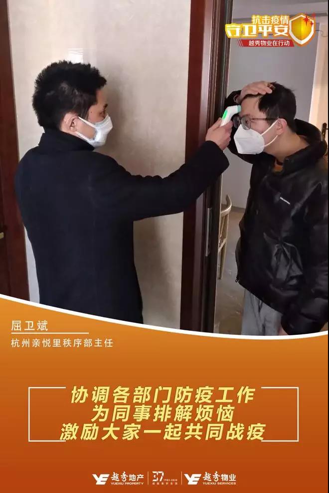 屈卫斌是杭州星空电竞·亲悦里物业服务中心秩序部主任,加入星空电竞物业才不到三个月,春节却主动选择留守岗位,与其他物业同事携手抗击疫情。每天6点天刚蒙蒙亮的时候,屈卫斌就起床开始他一天忙碌的工作。督促秩序员做好值守测温工作、与保洁主管安排园区消杀保洁;陪同管家为业主代购生活物资;协同社区人员上门排查人员信息……协助各部门处理完工作后已是中午,屈卫斌又马不停蹄,亲手为同事做午饭,让辛苦忙碌了一上午的同事都能吃上热乎的饭菜。“尽管工作很忙很累,回到服务中心还能有口热乎的饭吃,感觉像是回到了自己家一样”,区卫斌的同事感慨道。晚上下班后,区卫斌仍没有停歇,他还专门抽出时间为同事排解烦恼,激励他们一起打赢这场没有硝烟的战争。