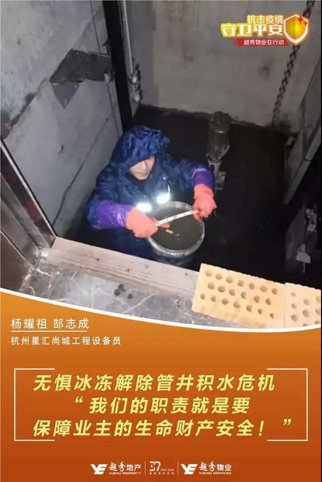 2月初的某天,杭州下起了毛毛细雨,天气阴冷潮湿,杭州星空电竞·星汇尚城某楼栋因业主家管道爆裂导致电梯管井积水,物业服务中心得知情况后,第一时间赶到了现场。因事项紧急,工程组两位小伙杨耀祖、郜志成毅然跳入冰寒彻骨的积水,一桶一桶地将水提出,和客服、秩序组的小伙伴们一起接力,在最短的时间内将井底积水清除干净,使电梯及时恢复运行,有效避免了安全事故的发生。