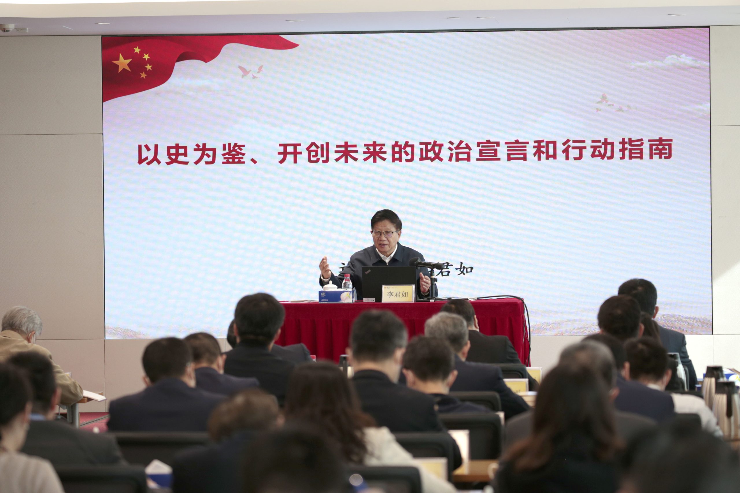 报告会上,李君如教授围绕《中共中央关于党的百年奋斗重大成就和历史经验的决议》(以下简称《决议》)作了题为《以史为鉴、开创未来的政治宣言和行动指南》的专题宣讲报告。报告从对三个“历史决议”的对比讲解中深入阐释了党的十九届六中全会通过《决议》的重大意义,深刻说明我们党善于在总结历史经验中掌握历史主动;从“两个始终”、“四个伟大成就”、“四次伟大飞跃”、马克思主义中国化“三次历史性飞跃”、“五大历史意义”、“十大历史经验”、牢记“一个根本问题”七个方面系统宣讲了《决议》的整体框架、主要内容和党百年奋斗的历史成就、历史意义、历史经验,深刻说明了党百年奋斗书写了中华民族历史上最恢宏的史诗;从对《决议》重点、亮点和对习近平新时代中国特色社会主义思想作出的新概括深刻阐释了新时代的历史性成就、历史性变革和“两个确立”的决定性意义,深刻说明了中国特色社会主义在21世纪的根本方向;并从坚持历史自信、坚持党的政治建设、坚持担当责任、坚持自我革命四个方面强调要以新时代的“赶考精神”贯彻落实好《决议》,为奋力实现第二个百年奋斗目标贡献力量。报告史实详实、内涵丰富、重点突出、生动鲜活,既有理论深度又通俗易懂,受到了线上线下广大党员的热烈欢迎。